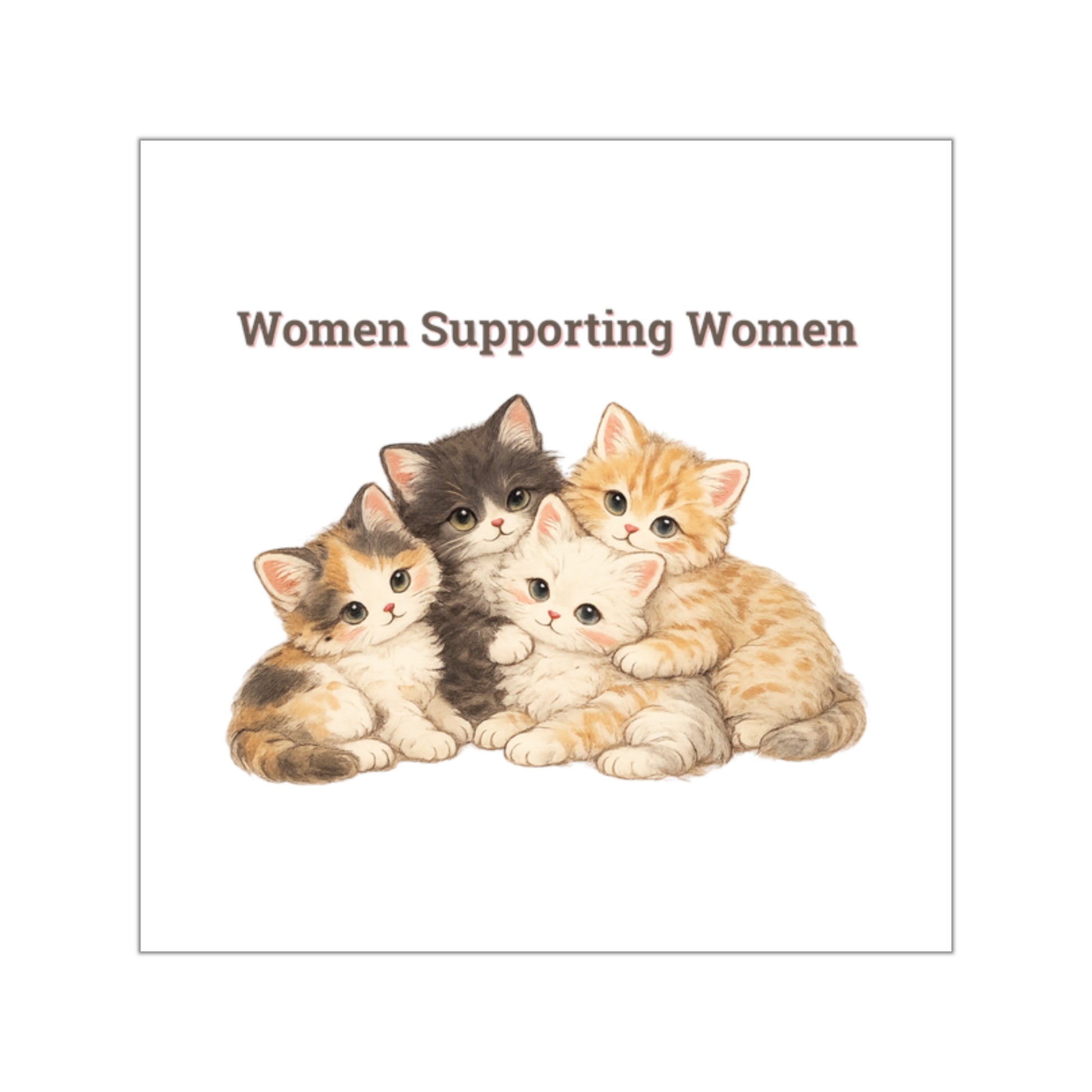 Soft-eyed kittens curl together beneath the simple, heartfelt line “Women Supporting Women.” This glossy square vinyl sticker brings a warm, playful charm to laptops, journals, water bottles, or windows — a small, steady reminder of solidarity every time you see it. The artwork’s gentle palette and cozy composition fit naturally into a workspace, planner, or café tote, and the durable vinyl keeps the image bright whether it rides the daily commute or brightens a quiet desk corner.